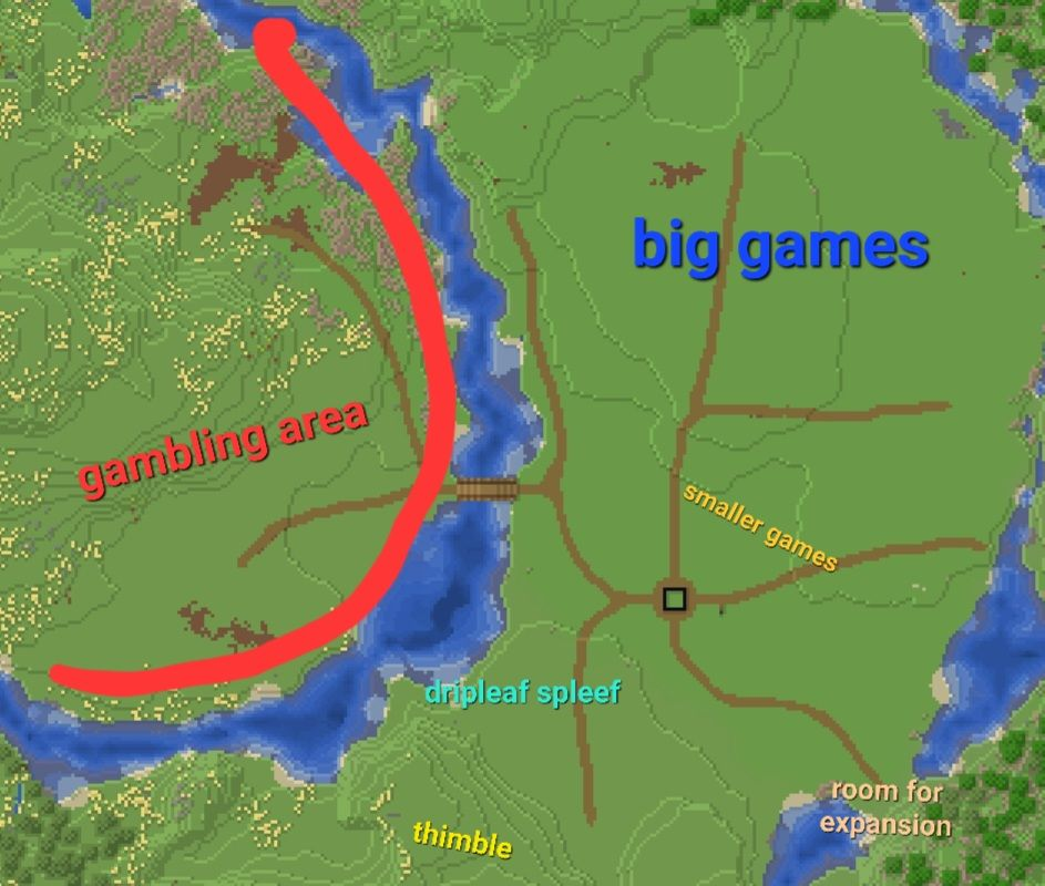 - All casino and gambling-based games must be built across the bridge, within the designated area connected by the deepslate path